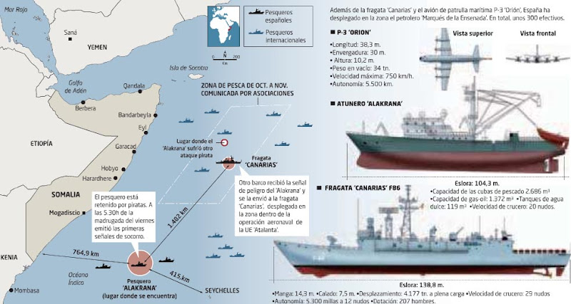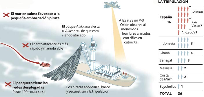 El sábado 3 de octubre le tocó a la flota española. Un atunero de nombre Alakrana, fue asaltado a las 5:30 de la mañana y lo más que pudo hacer antes de ser capturado fue enviar una señal de alarma a otro de los pesqueros de la misma compañía que se encontraba faenando en la zona. Los 36 tripulantes quedaron secuestrados, mientras la fragata Canarias a 800 millas del secuestro, recibía el aviso y enviaba inmediatamente 3 aviones militares que no pudieron hacer sino confirmar el secuestro, viendo como el barco se dirigía hacia la costa de Somalia.
