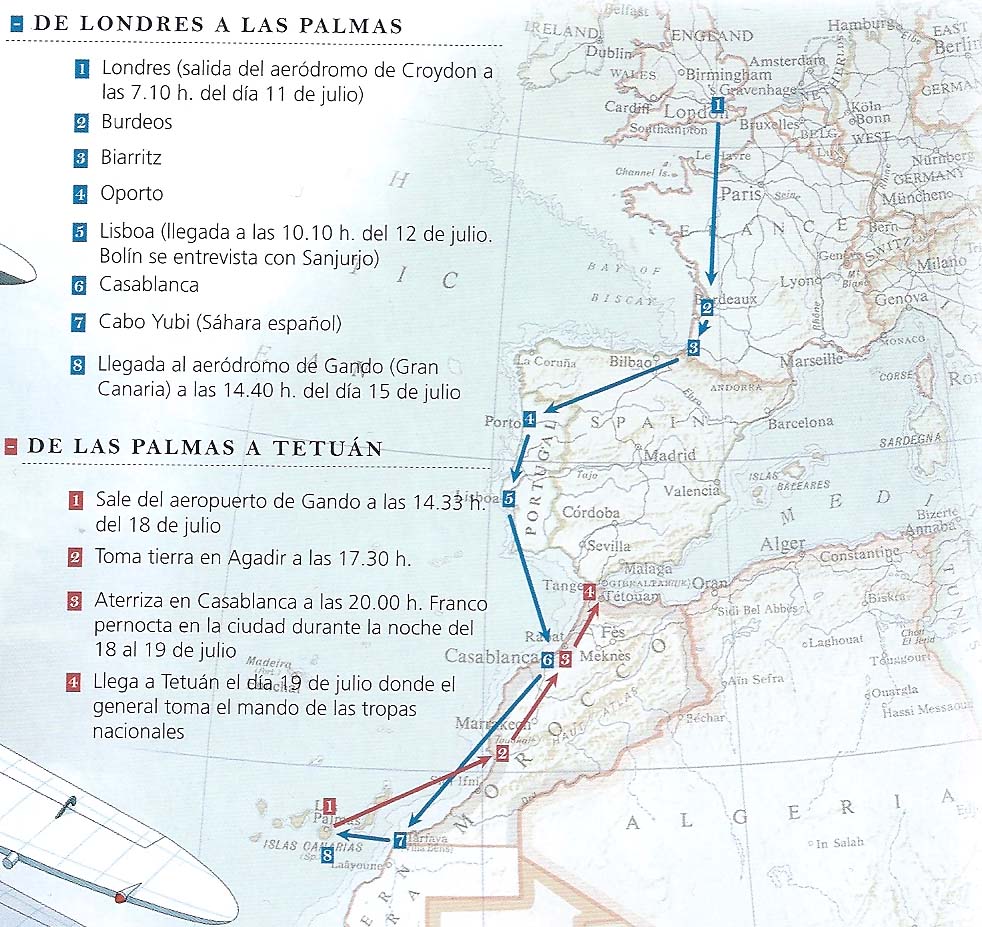 El periplo de este avión comienza el 11 de julio en Londres y concluye el 19 en Tetuán, a donde se traslada Franco desde Canarias para encabezar la sublevación.