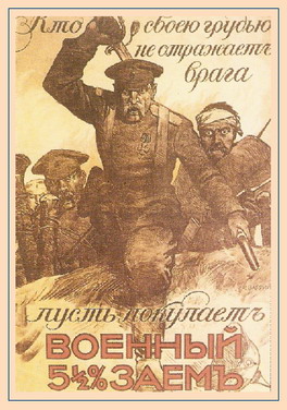 Cartel patriótico solicitando a la población que compren bonos de guerra para mantener a los soldados rusos en la Primera Guerra Mundial; un conflicto que se convertiría en la tumba del zarismo debido a las continuas derrotas que acabarían desembocando en la Revolución de 1917.