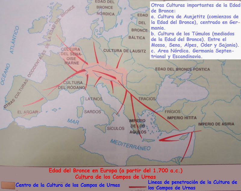 Esta cultura aparece por primera vez en Europa del Este y norte de Alemania hacia el 1.700 a.c. y en escasos 500 años se extiende por toda Europa siguiendo las líneas que se muestran en el mapa, un movimiento que quizás pueda ser debido a las continuas migraciones. La Cultura de las Urnas fue precedida por la Cultura de los Túmulos y le sucedió la Cultura Hallstat.