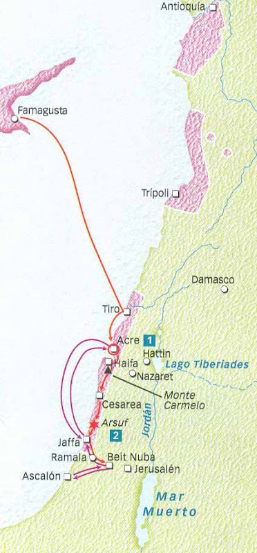 Finalmente en junio de 1191, el ejército de Ricardo desembarcaba en Acre. Las huestes de Felipe II llevaban ya dos meses y mucho tiempo mas los restos del ejercito de Barbarroja.