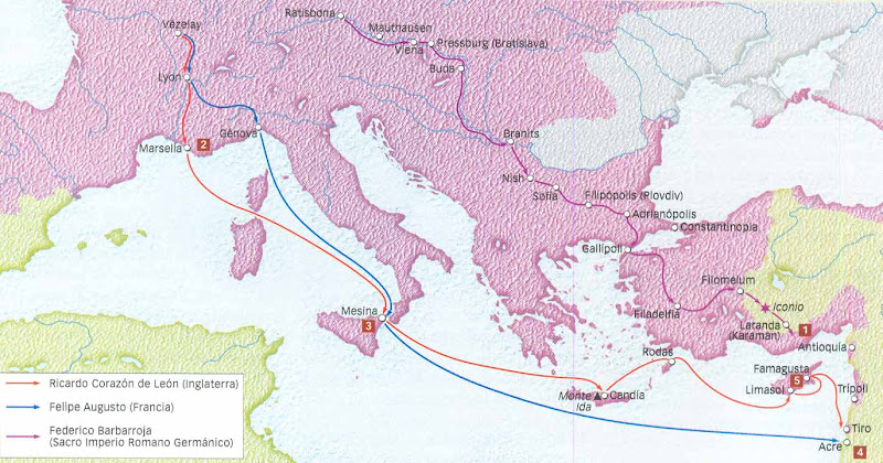 Los Plantagenet (la casa del rey de Inglaterra) y los Capetos (la casa del rey francés) se enzarzaron en una guerra y para cuando llegaron las fechas de partida, hacia verano de 1189, ni ingleses ni franceses lo hicieron. Quien si comenzó su aventura fue Federico Barbarroja, pero el infortunio perseguía a esta empresa y éste se ahogaba en las aguas del rió Salef en junio de 1190.