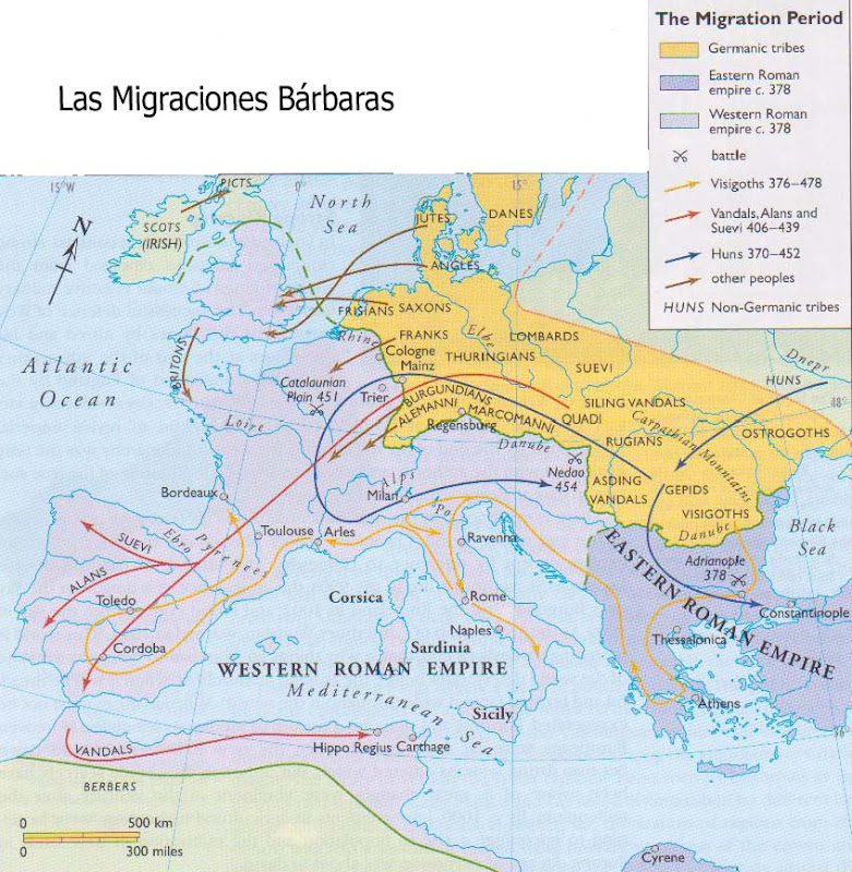 El siglo V es el gran periodo durante el cual los pueblos en migración van asentándose a lo largo de toda Europa. Cabe destacar a los: