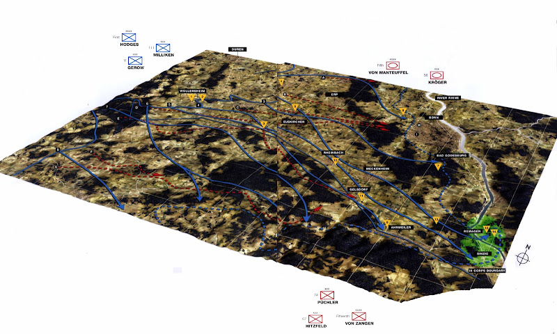 En el mapa podemos observar los avances que los aliados habían realizado durante los meses de febrero y marzo (líneas en rojo discontinuas – con las fechas de cada uno de los frentes), hasta su final posicionamiento en torno al 10 de marzo en las fronteras del Rin.